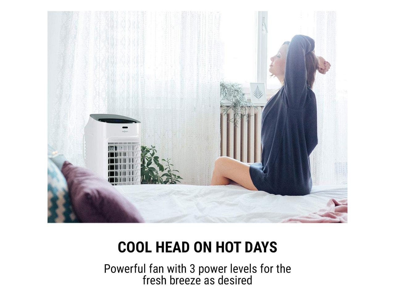 Přepínatelný chladič vzduchu zajišťuje chlazení vzduchu v kanceláři nebo v obývacím pokoji. Z jeho 4litrového zásobníku na vodu se odpařuje během hodin do proudu vzduchu chladná voda, čímž se nejen snižuje teplota v místnosti způsobem, který je šetrný k životnímu prostředí a hospodárný, ale také se současně zvyšuje vlhkost vzduchu pro uvolněné dýchání. Pokud je třeba doplnit vodu, stačí jednoduše vytáhnout nádrž. Dva přídavné chladiče mohou zvýšit chladicí výkon energeticky úsporným způsobem.