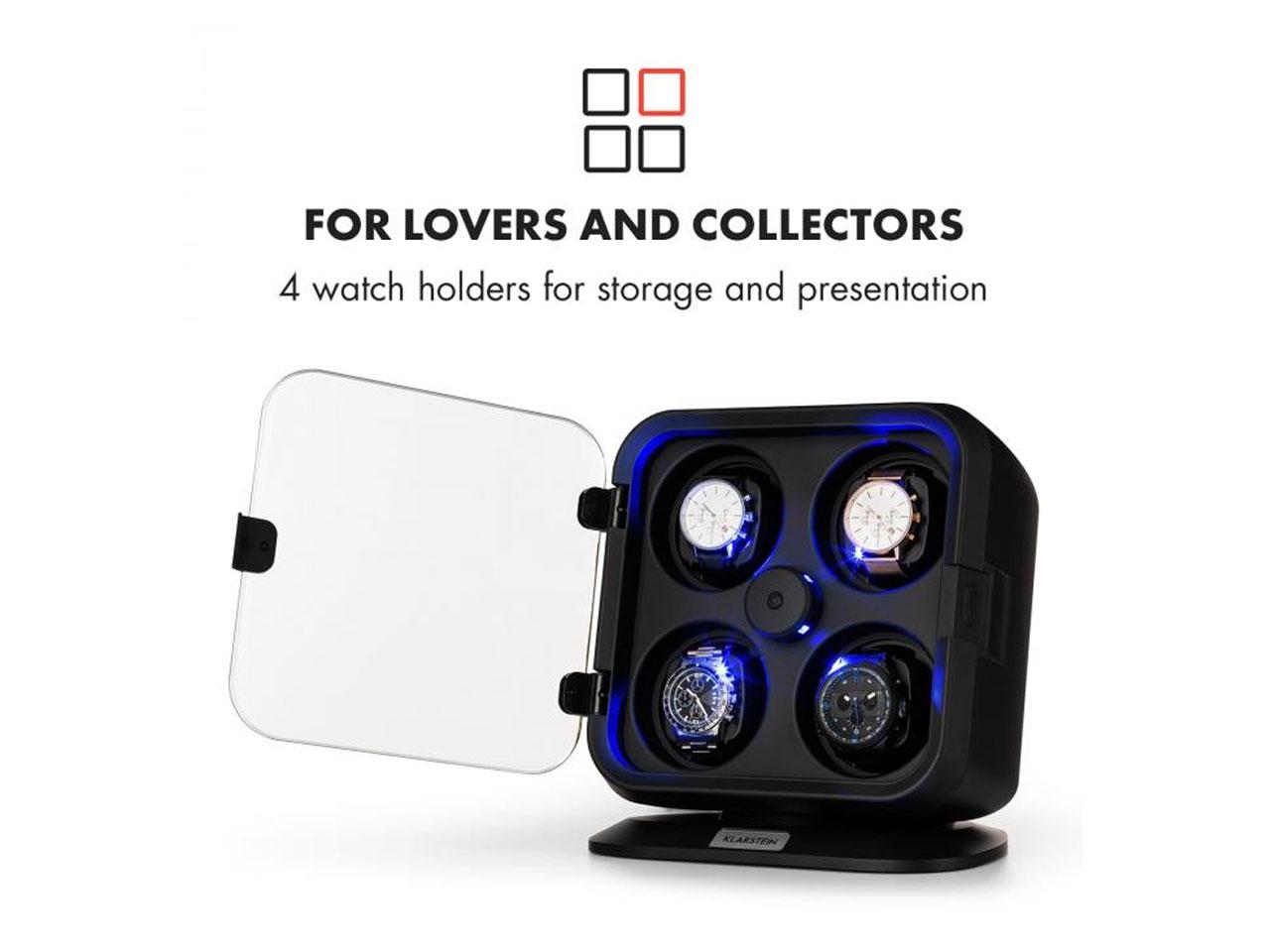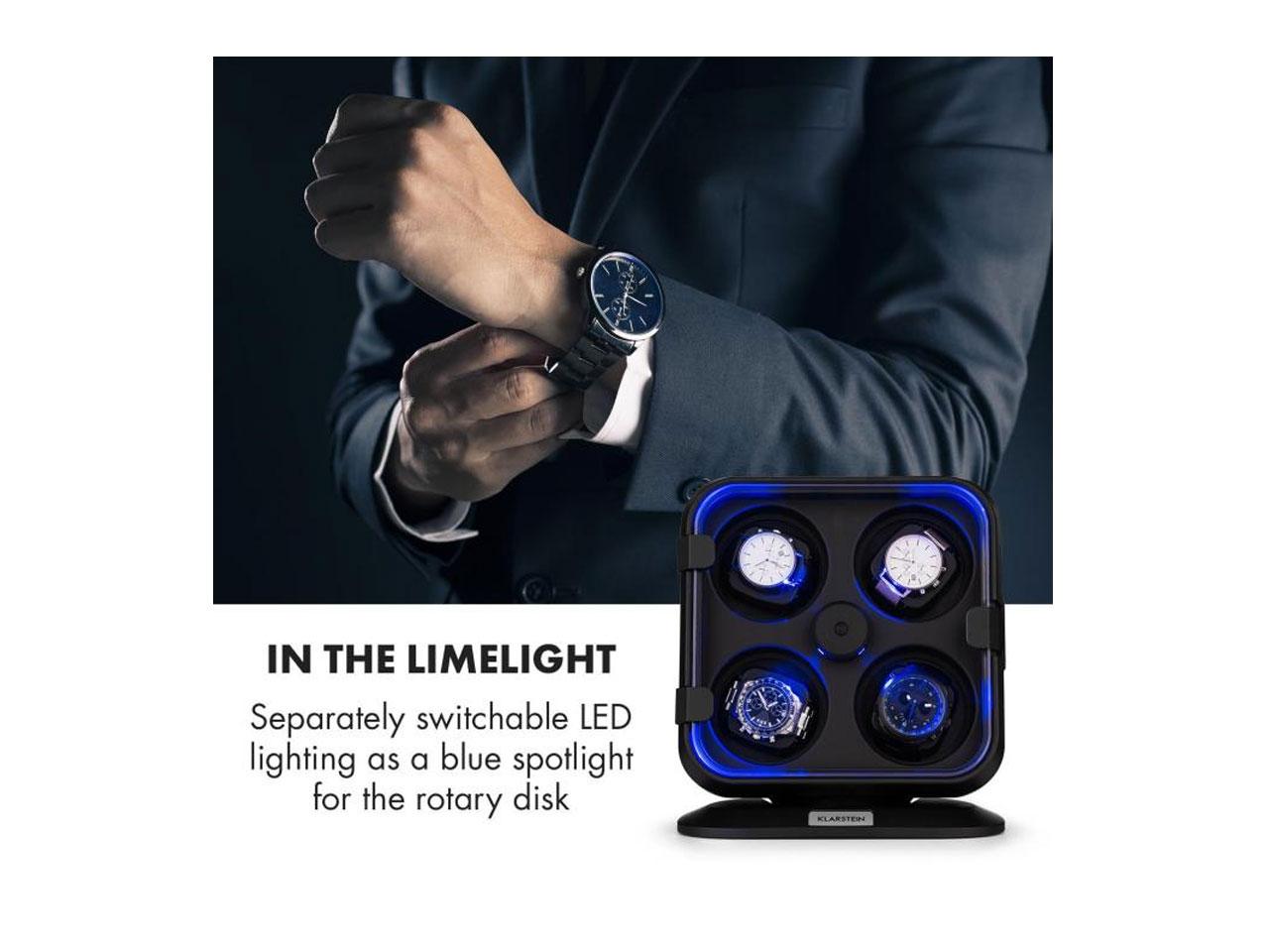K dokonalému skladování hodinek však nepatří pouze technický aspekt: hodinky s automatickým natahováním chtějí být a měly by být viděny! Perfektní prezentační design pohyblivého stojanu na hodinky Klarstein Clover to má na zřeteli. Jeho elegantní, černá skříňka umožní ty nejlepší pohledy díky průhledným předním dvířkům. Přepínatelné modré LED osvětlení dodává otočnému podstavci nevtíravé bodové osvětlení a šikovně uvádí uložené hodinky na scénu.