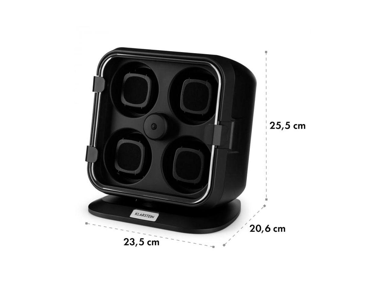 Kdo má své vlastní natahovací hodinky, měl by si dělat starosti s jejich správným uskladněním. Pohyblivý stojan na hodinky Klarstein Clover Vás při tom podpoří podle svých nejlepších schopností. Na jeho otočném podstavci najde místo až čtvero hodinek, čímž hodinky získají potřebnou rotaci, aby zůstali běžet i ve dnech nenošení a aby byly zároveň stylově prezentovány. Odnímatelné prodlužovací podložky a pružinový napínací mechanismus umožňují upevnění všech hodinek s náramkem dlouhým 15 až 20 cm a širokým až 2,9 cm. Koncepce volby nabízí kromě toho různé režimy otáčení a různé rychlosti otáčení, aby se vyhovělo všem hodinovým strojkům. Takže je možné zvolit samostatně pro každou otočnou podložku otáčení ve směru pohybu hodinových ručiček, proti směru pohybu hodinových ručiček nebo obousměrnou rotaci. K dispozici je 650, 900, 1200 a 1500 otáček za den.