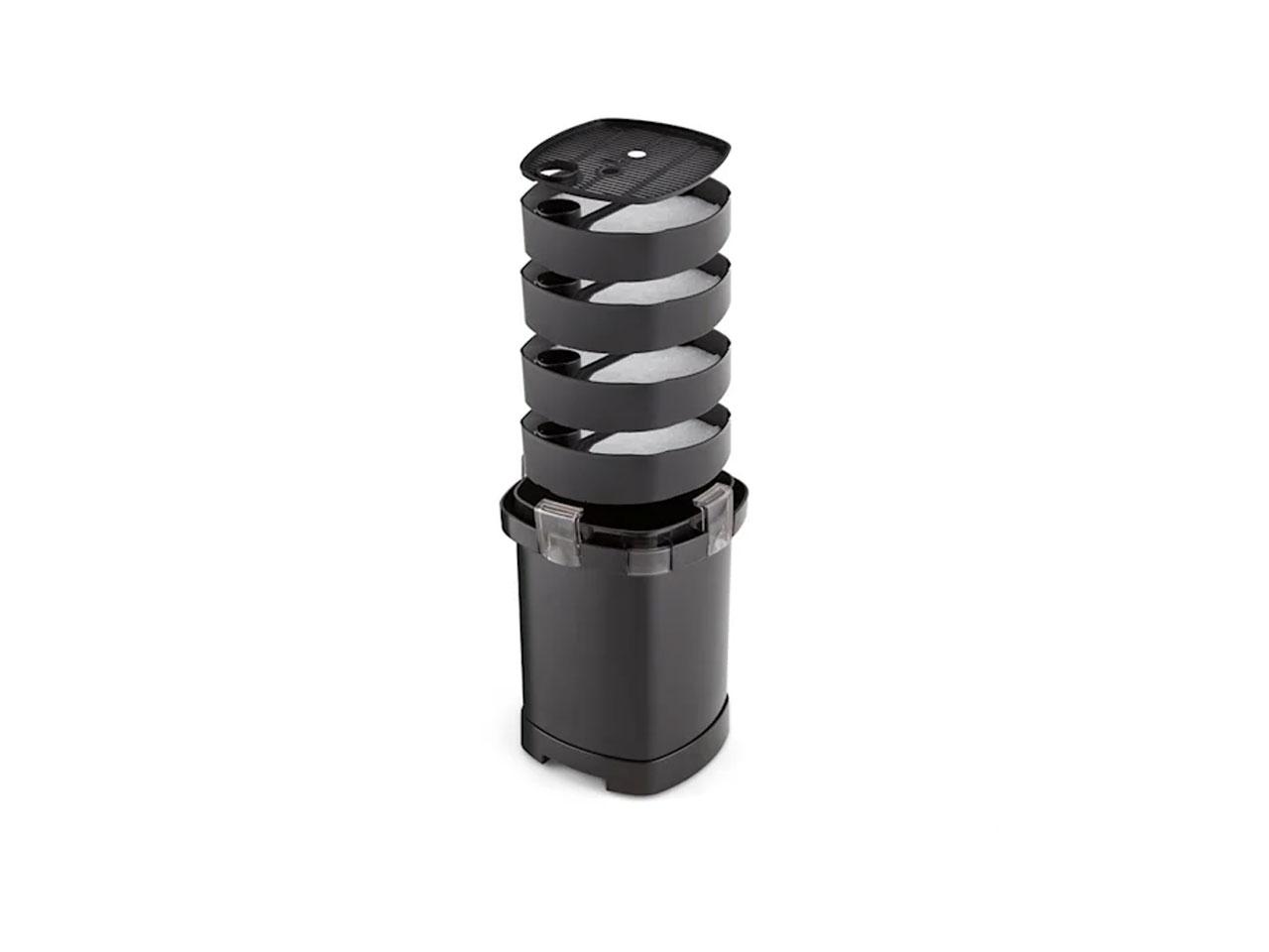 Jeho 4stupňový filtrační systém, skládající se ze čtyř jednotlivě odnímatelných filtračních košů, se skrývá uvnitř čističky na vodu. Každý koš může být naplněn různými filtračními materiály, například bio kuličkami, keramickými kroužky nebo filtrační vatou, aby se tímto způsobem odstranily rozmanité složky a velikosti částic z protékající vody. Celý popis