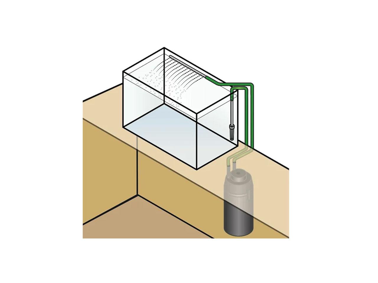 Odebrání nebo přivedení akvarijní vody se provádí pomocí snadno ovladatelného zásuvného systému trubek, který je přísavkami nenápadně umístěn na stěnu akvária pod víkem, případně v rohu. Ochranný koš sací trubky na vodu zařízení Waldbeck Clearflow 14 zabraňuje náhodnému vtažení obyvatelstva akvária do filtračního systému.