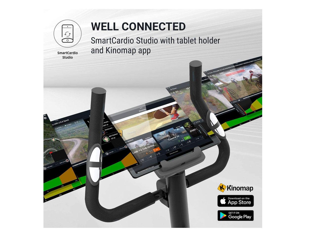 Tréninkové kolo se setrvačnou hmotností 12 kg má také držák na tablet SmartCardio Studio, který umožňuje umístění vhodného zařízení a tedy vedle tréninku nabízí i všestrannou zábavu. Používáním aplikace Kinomap může kromě toho fotoaparát Vašeho tabletu nebo smartphonu rozpoznávat Vaše pohyby a umožní Vám tak prozkoumat mnoho virtuálních tratí. Protiskluzové pedály s nastavitelnými popruhy na nohy také pomáhají při zabezpečení optimálního přenosu energie z nohy na pedál, zatímco praktické transportní kolečka zaručují flexibilní přemísťování pevné ocelové konstrukce.
