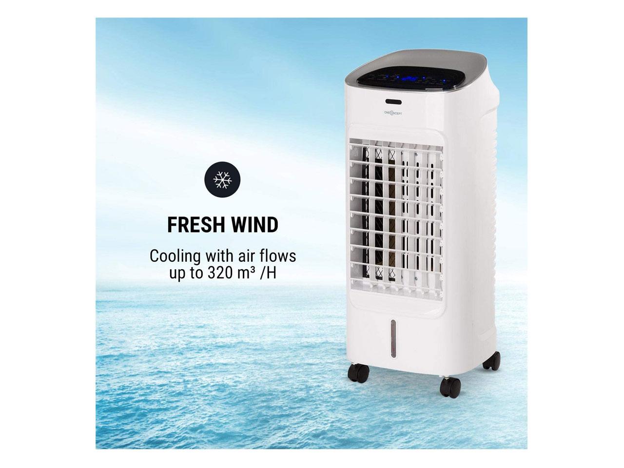 Přepínatelný chladič vzduchu zajišťuje chlazení vzduchu v kanceláři nebo v obývacím pokoji. Z jeho 4litrového zásobníku na vodu se odpařuje během hodin do proudu vzduchu chladná voda, čímž se nejen snižuje teplota v místnosti způsobem, který je šetrný k životnímu prostředí a hospodárný, ale také se současně zvyšuje vlhkost vzduchu pro uvolněné dýchání. Pokud je třeba doplnit vodu, stačí jednoduše vytáhnout nádrž. Dva přídavné chladiče mohou zvýšit chladicí výkon energeticky úsporným způsobem.