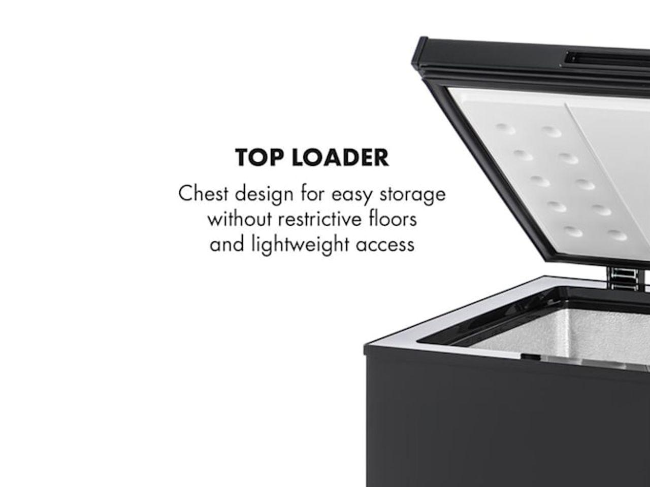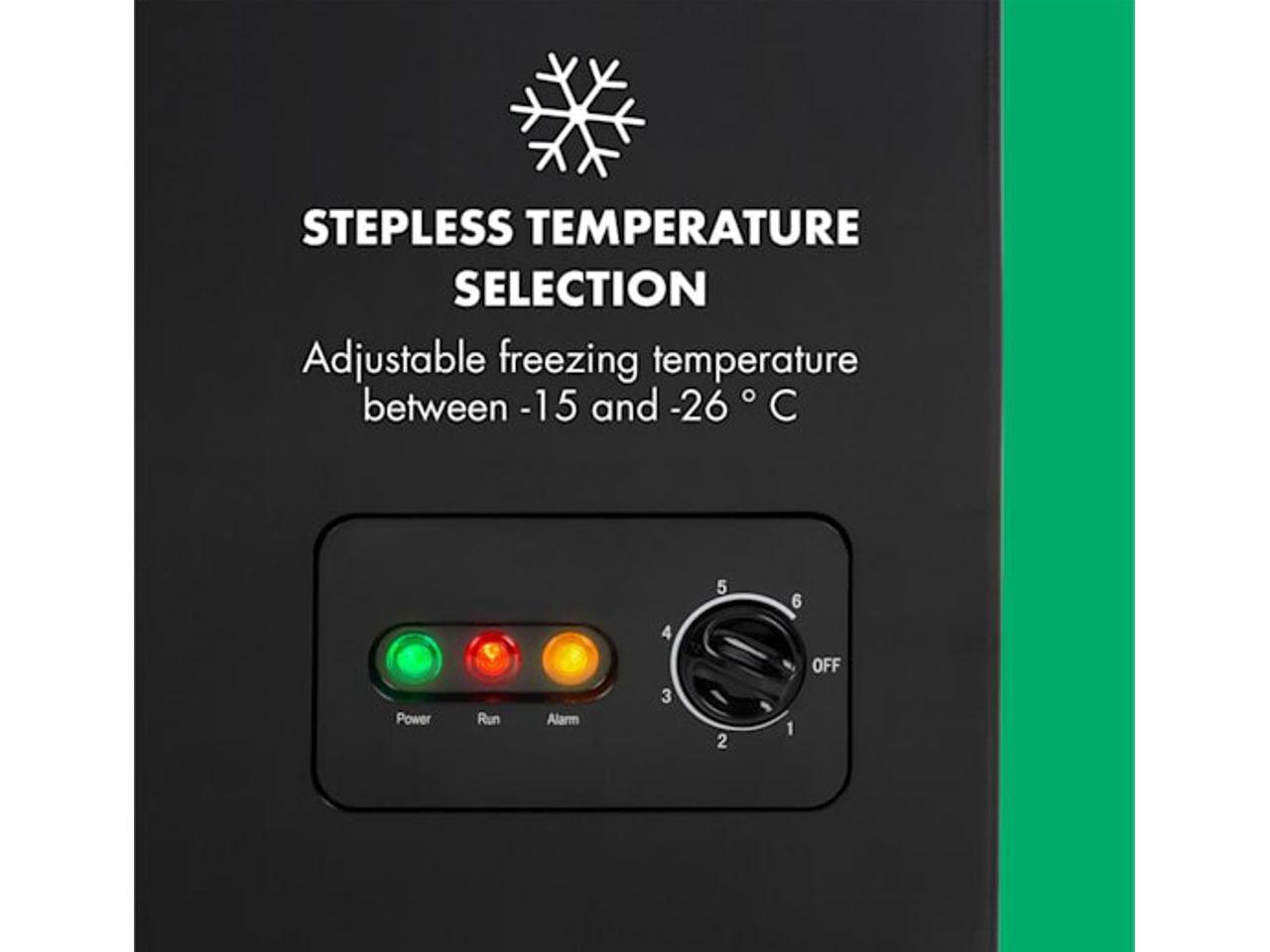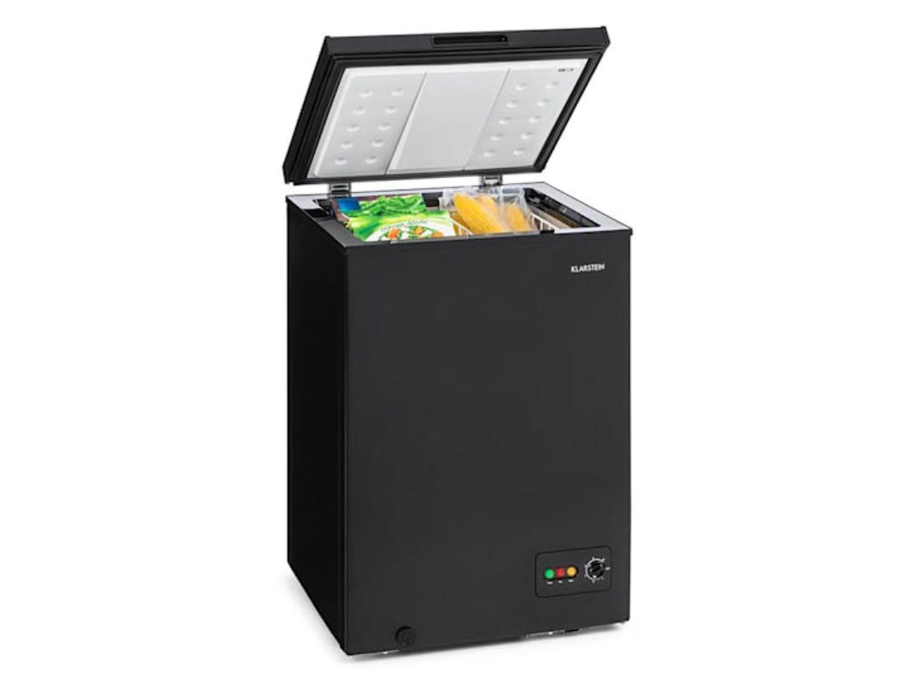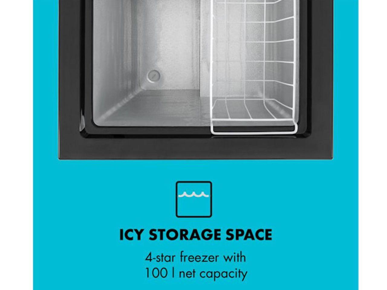 S kapacitou 100 litrů nabízí 4hvězdičková mraznička dostatek prostoru pro menší i větší kusy zmrazených potravin. Truhlový design umožňuje nekomplikované uskladnění bez ohraničených odkládacích přihrádek a také snadné vyjímání shora. Odnímatelný závěsný koš slouží k umístění drobných věcí, které by měly být rychle po ruce - například nanuky, následující oběd nebo mražené bylinky. Mrazící výkon lze nastavit od -15 do -26 °C pomocí plynule regulovatelného otočného regulátoru na přední straně zařízení. Mrazicí box Klarstein Iceblokk 100 má přitom příkon pouze 75 W, což mu přináší třídu energetické efektivity A +. Až do 10 kg potravin lze zmrazit během 24 hodin.