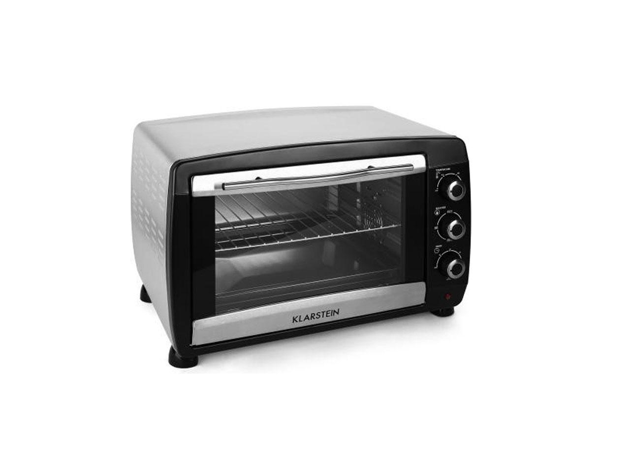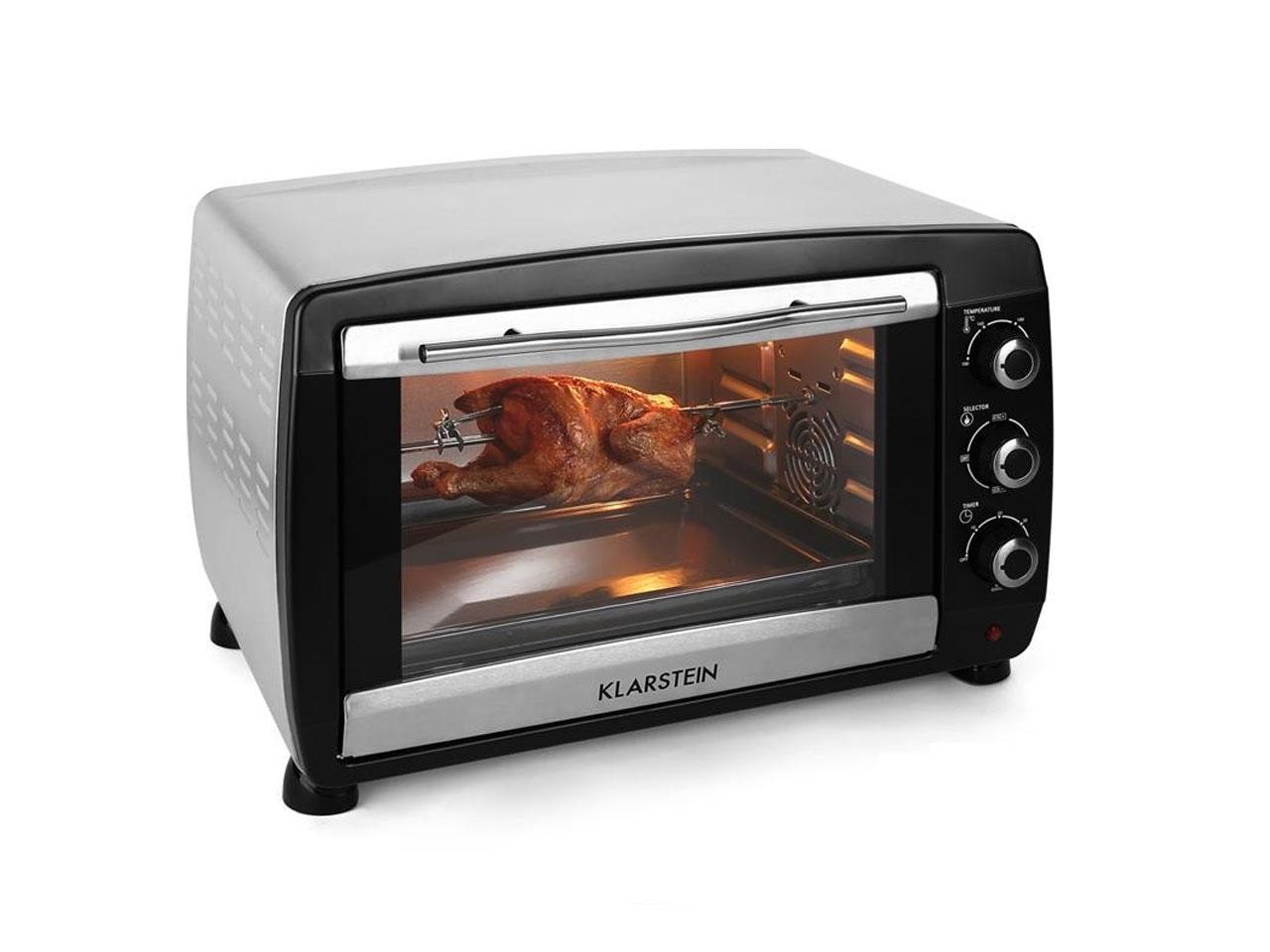 Dle přání lze pomocí obou páčkových přepínačů použít horní nebo spodní ohřev nebo kombinace obou. Zvláštností je funkce cirkulujícího vzduchu a otočného špízu, které zajišťují rovnoměrné ohřívání a opečení kuřete, kebabu nebo jiných pochoutek. Integrovaný časovač lze plynule nastavit na dobu 60 minut, do 230 °C regulovatelný termostat dává zařízení potřebný prostor pro celou řadu nejrůznějších jídel a receptů. Po uplynutí nastavené doby přípravy ukončí práci zvukový signál. Jednoduše čistitelná konstrukce grilovací trouby Klarstein Omnichef 45B z nerezové oceli je vybavena protiskluzovými nožičkami, rukojetí z nerezové oceli a okénkem z bezpečnostního skla, takže budete mít vždy přehled o procesu přípravy Vašeho pokrmu. Ovládání probíhá přes uspořádanou obsluhovací sekci s 3 otočnými regulátory a srozumitelnými symboly. Dodávané příslušenství je stejně rozsáhlé jako rozsah funkcí trouby Klarstein Omnichef 45B Kromě grilovacího roštu, plechu na pečení a špízu jsou součástí dodávky dva držáky pro nekomplikované vybírání.