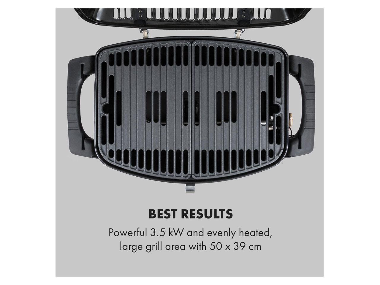 Nejlepší výsledky: výkon 3,5 kW a rovnoměrné vyhřívání, velká grilovací plocha o rozměrech 50 x 39 cm