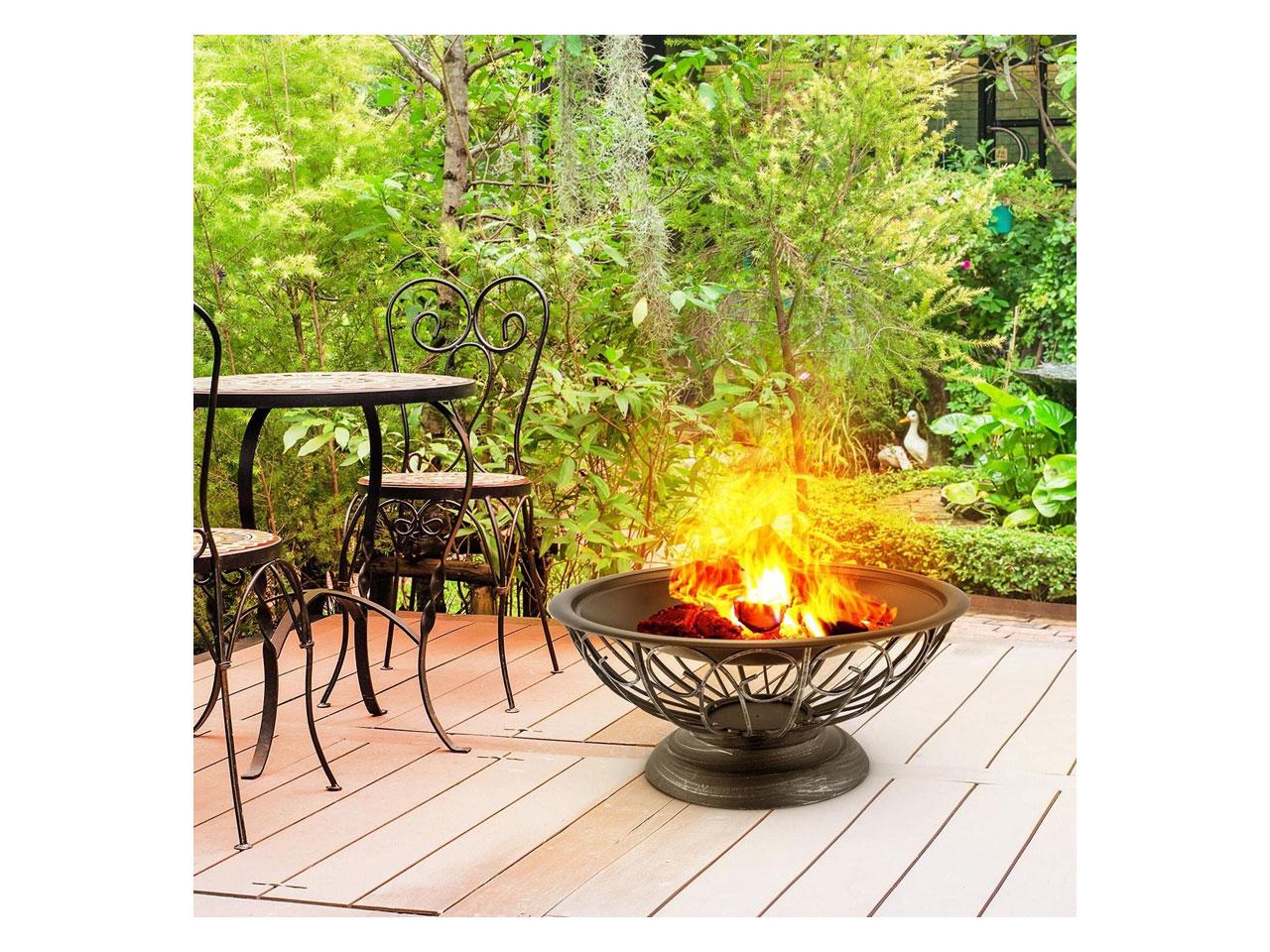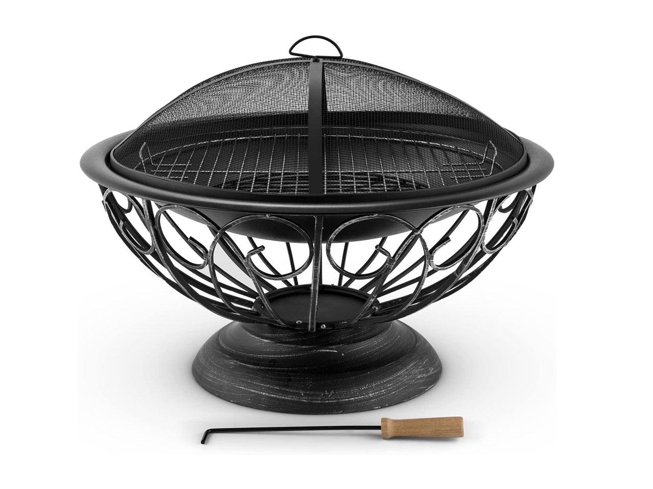 S průměrem mísy 75 cm nabízí ohniště dostatek prostoru pro velký táborák z polen. 60 cm vysoká, dekorativní spodní část mísy ji zvedá do výšky pro ještě lepší dojem z plápolajícího ohně. Ocelový lapač jisker z mřížkované sítě chrání ohniště před stoupající žárem a zabraňuje nechtěným následkům. S dodávaným pohrabáčem lze lapač snadno zvednout na stranu pro doplnění paliva nebo rozdmýchání ohně. Dřevěné uhlí nebo dřevo na topení jsou umístěny na roštu, což zajišťuje, že vyhořelý materiál se sbírá na dně mísy a umožňuje čisté vypálení. Takže nestojí nic v cestě společenskému setkání u hřejivého táboráku.