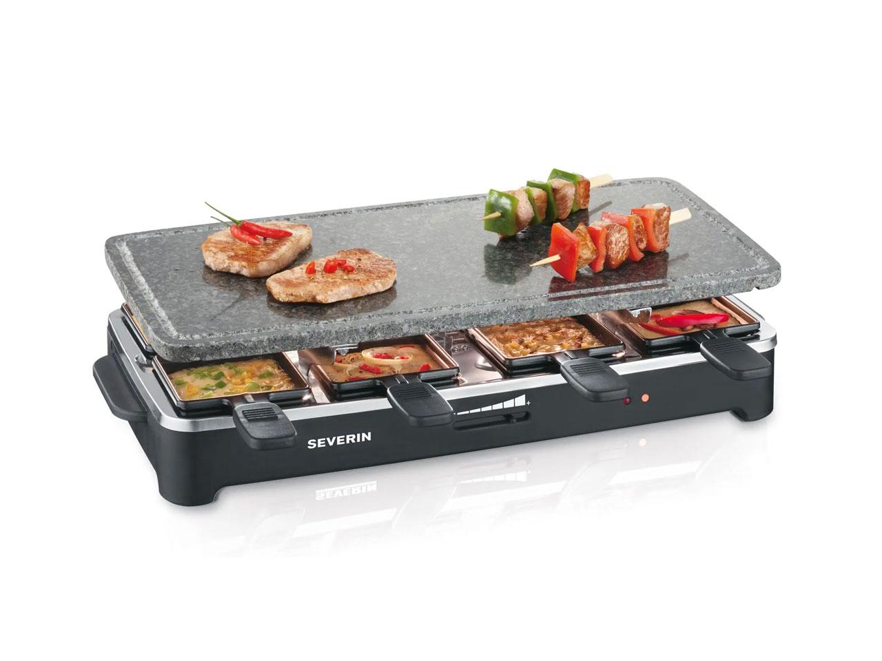 Raclette gril s lávovým kamenem Severin RG 2343 má ve výbavě 8 pánviček s nepřilnavým povrchem. Lávový kámen je vhodný pro zdravé grilování s omezením tuku. Celý popis