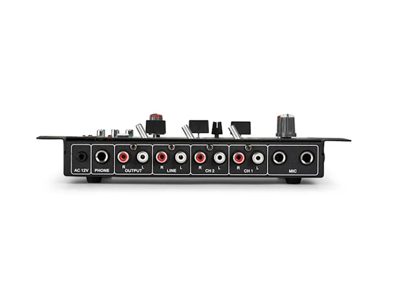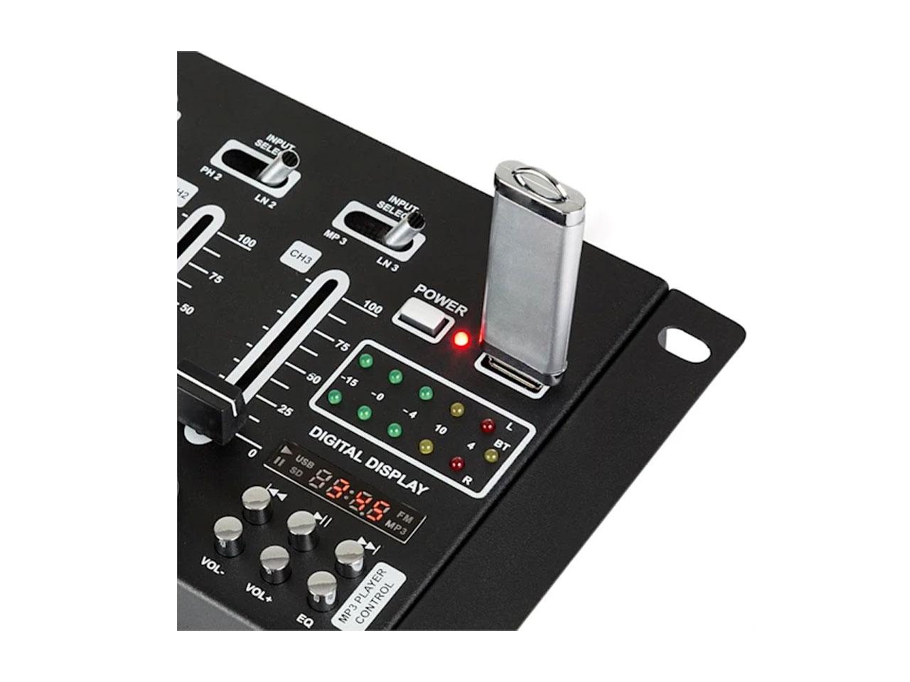 Na vrchní straně mixážního pultu čeká na své alternativní použití i USB připojení. Na čelní straně je přes line-in připojení lze připojit až 3 další audio zdroje. Zde se nacházejí také 6,3 mm jack připojení pro mikrofon a sluchátka a také line-in vstupy a line-out výstup. Resident DJ DJ-21 BT 3/2-kanálový mixážní pult na vrchní straně nabízí celkem 18 ergonomicky umístěných spínačů, páček a tlačítek. Pomocí těchto ovládacích prvků můžete ovládat 3 stereo a 2 phono kanály.