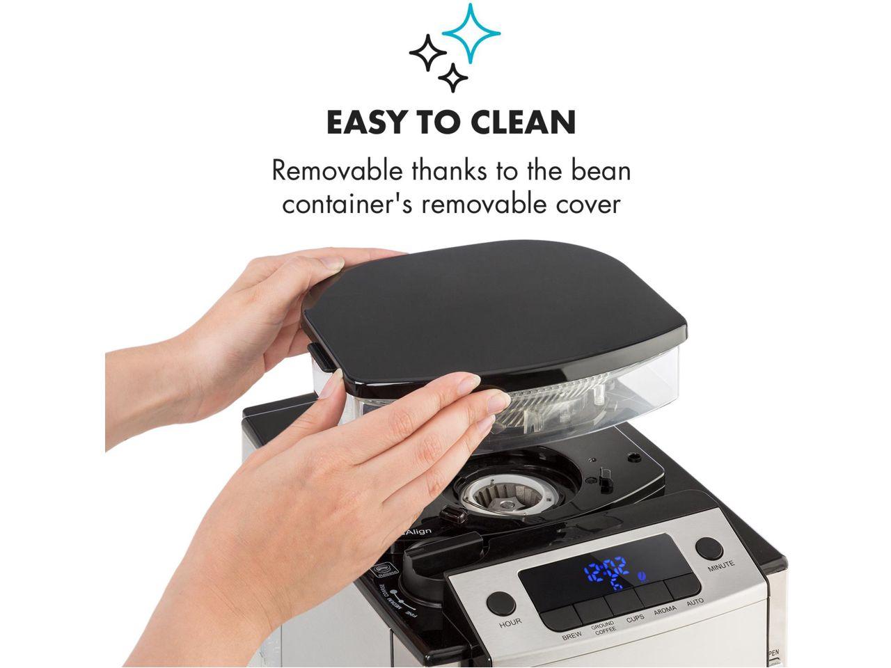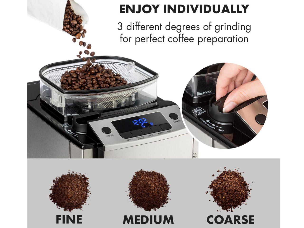 Znovu objevit požitek z kávy - díky kávovaru Klarstein Aromatica X. Integrovaný mlýnek zvládne umlít až 180 g kávových zrn v rámci jednoho uvaření. Díky třem volitelným stupňům pomletí - od velmi jemného po hrubé - máte možnost individuálního přizpůsobení intenzity kávy. Čím jemnější pomletá káva, tím bude silnější a aromatičtější. Kromě toho máte k dispozici i funkci Aroma + - dvojnásobný čas vaření vytěží nejintenzivnější aroma. Integrovaným časovačem můžete nastavit přesný čas spuštění kávovaru - tak vás ráno nebo večer může přivítat vůně čerstvě pomleté kávy. Samozřejmostí je i provoz s použitím již pomleté kávy. Všechna nastavení snadno ovládané na ovládacím panelu s LED displejem.