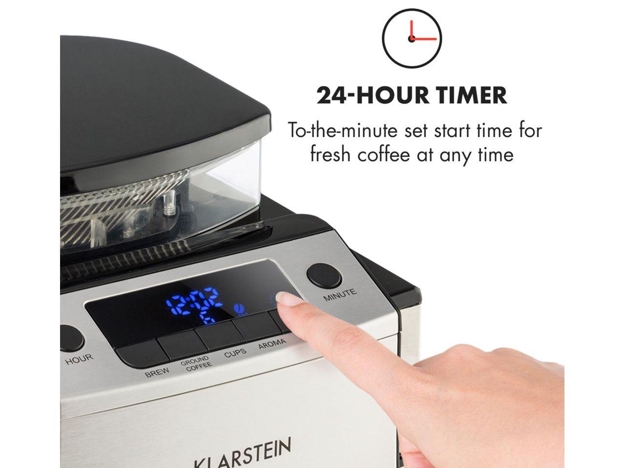 24hodinový časovač: minutový nastavitelný čas spuštění na čerstvě připravenou kávu při ranním vstáváním nebo po příchodu domů