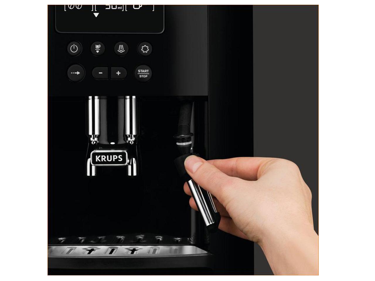 – automaticky probíhá indikace odvápňování, program proplachování i čisticí program. Manuální je pouze program čištění a proplachu trysky na mléko. Odnímatelný zásobník na vodu má objem 1,7 l a systém detekce vás vždy upozorní, kdy je třeba jej naplnit. Kávovar Krups má také sběrnou nádobu na odpad z kávy. S parní tryskou si napěníte mléko a připravíte tak vaši oblíbenou kávu s mléčnou pěnou.
