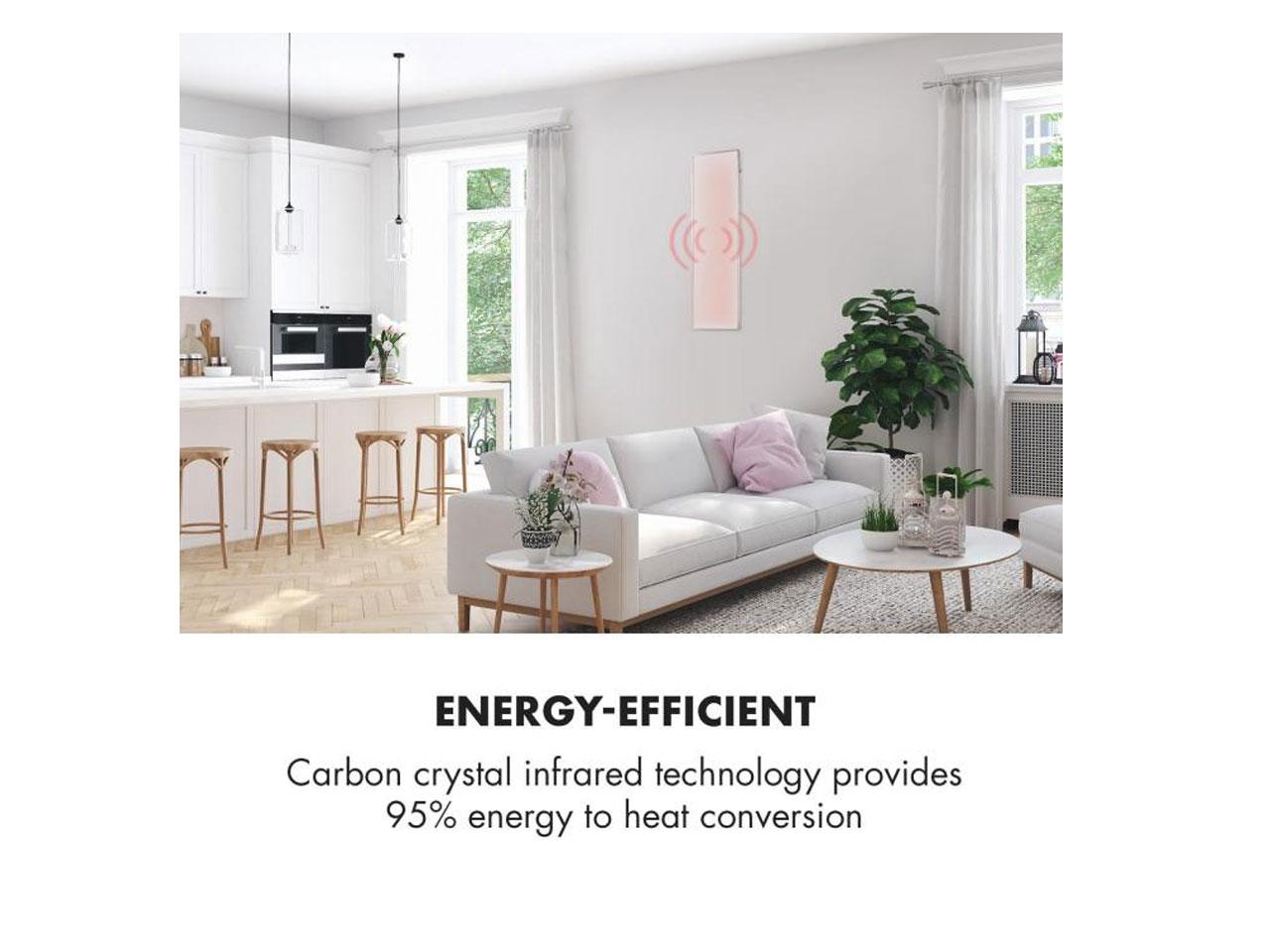 Klarstein Wonderwall 30 představuje revoluci nejnovější techniky vyhřívání. Velmi plochý panel o rozměrech 30 x 100 cm se dá zavěsit přímo na stěnu nebo strop, čímž značně šetří místo. Výkon 300 W produkuje velmi příjemné infračervené teplo nasměrované přímo na osoby. Topný panel je přitom energeticky velmi úsporný: díky technologii Carbon Crystal Infrared se až 95 % energie přeměňuje na teplo.