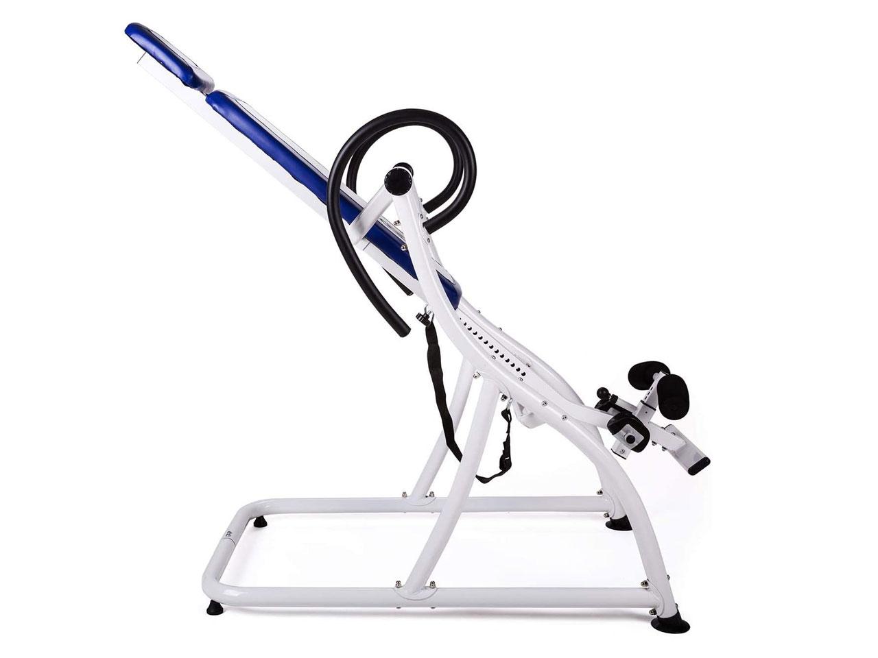 Inverzní lavička je zatížitelná max. 150 kg a může být variabilně přizpůsobena pacientům díky svému 20 násobnému výškovému nastavení. 5 cm tlusté pěnové čalounění na lavičce i polstrování fixace kotníku na noze zaručují během cvičení komfort. Pomocí nylonového popruhu může být ohraničena maximální inverze lavičky, která je asi 180°. Pomocí bočních ergonomických bezpečnostních rukojetí je možné bezproblémové vzpřímení z každé pozice.
