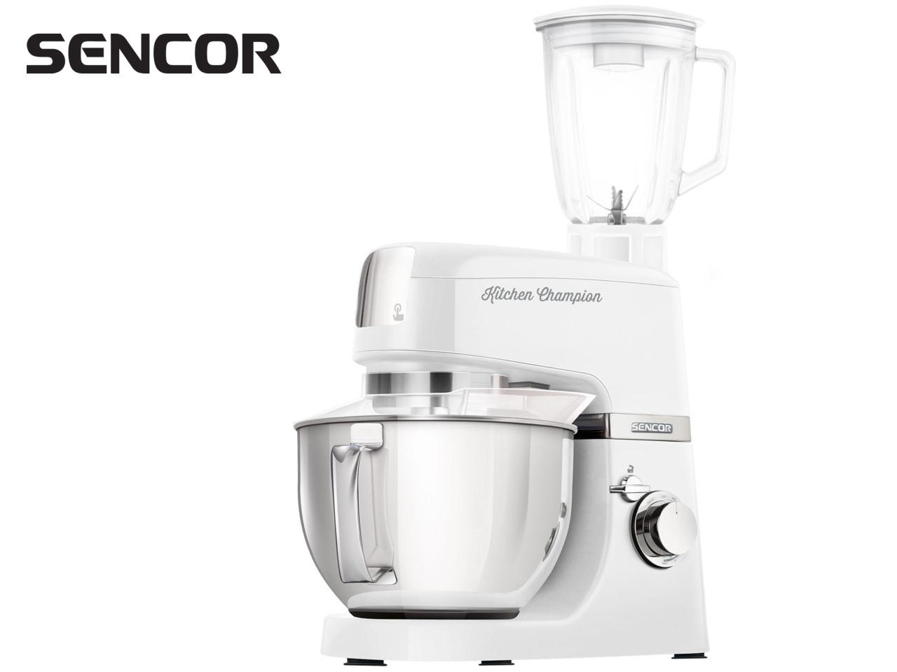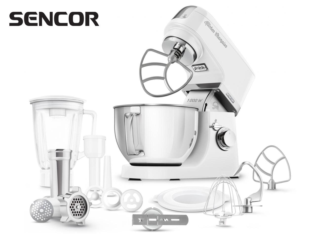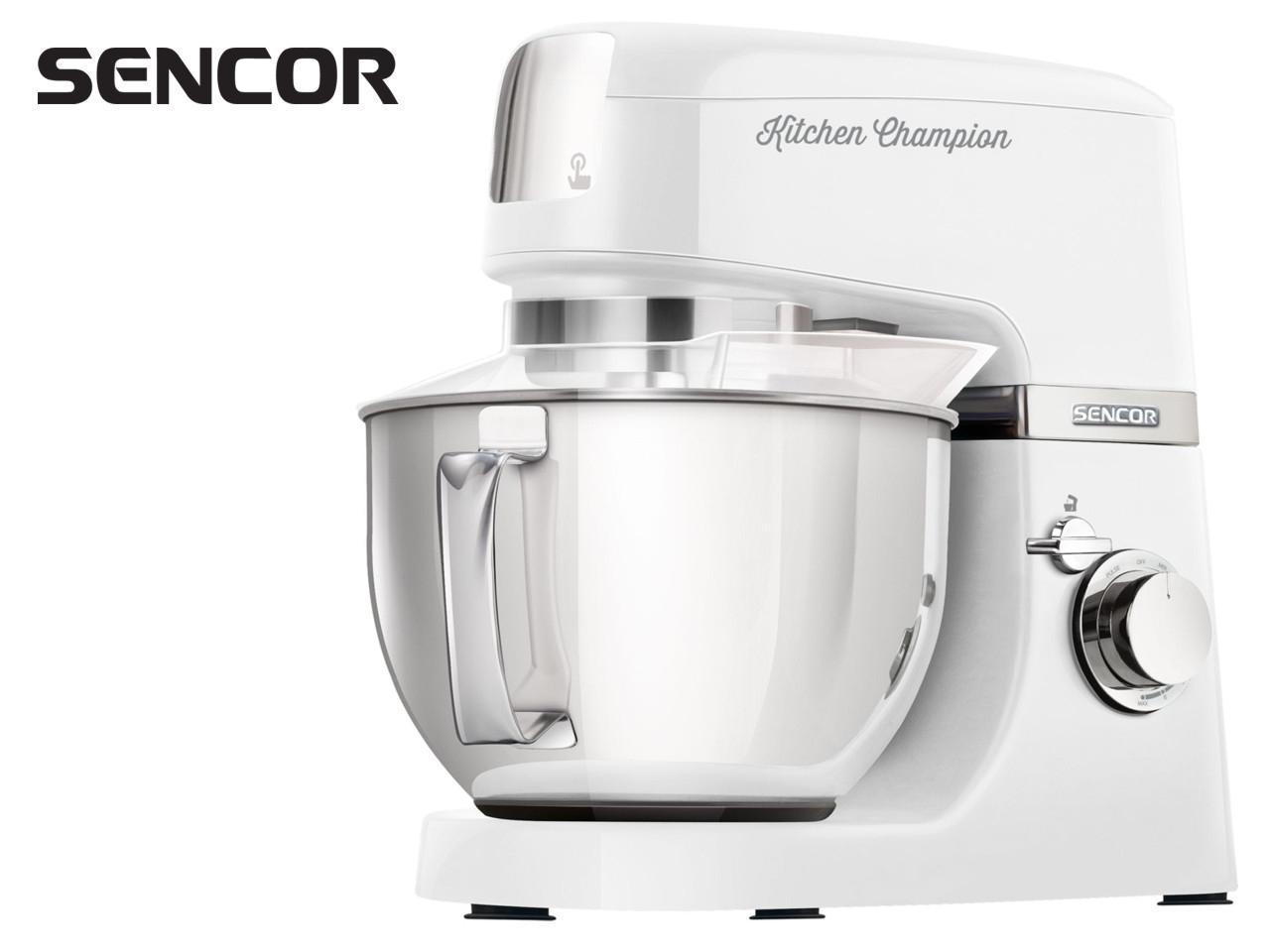 Kuchyňský robot Sencor STM 6350WH s bajonetovým systémem, výkyvným ramenem a 8 rychlostmi, do kterého se vejde až 1,5 kg těsta. Celý popis
