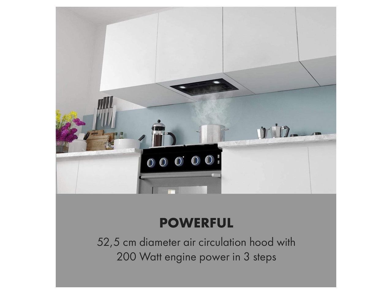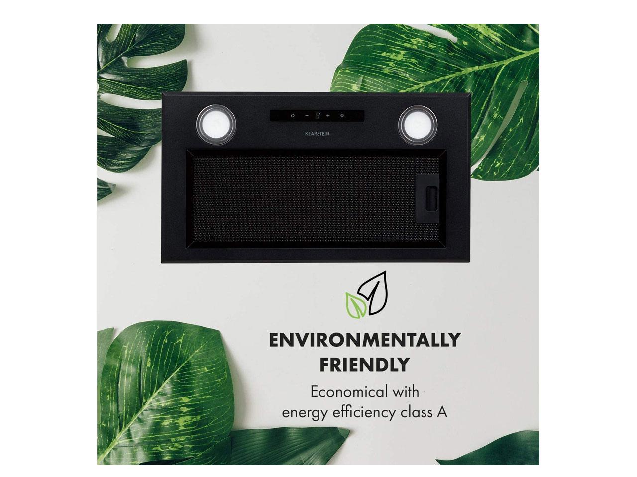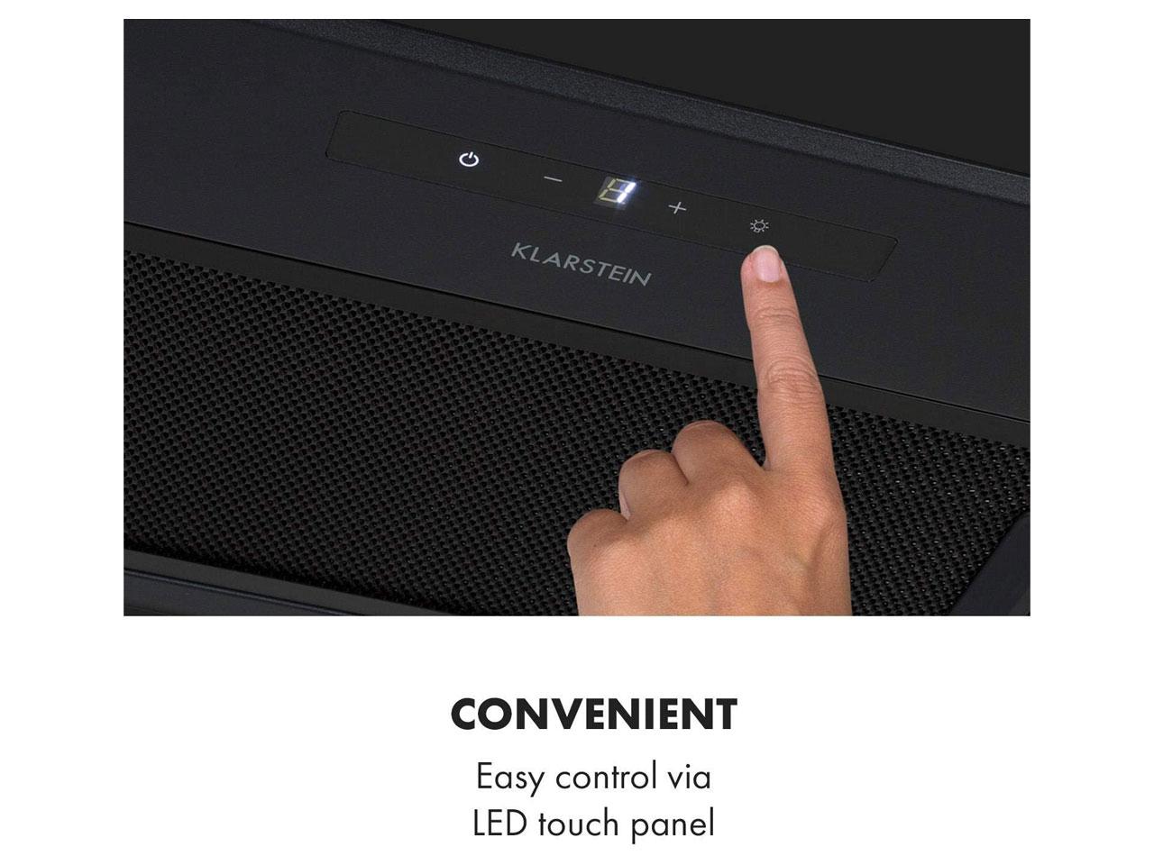 Digestoř Klarstein Paolo se postará s výkonem 200 W v režimu odsávání vzduchu o čistý vzduch v malých až velkých kuchyních. Tři úrovně výkonu umožňují odsávání až 600 m³ vzduchu za hodinu a cíleně přizpůsobují zabudovaný kryt digestoře výparům z vaření. Speciálním prvkem našeho jen 52,5 cm širokého a 29,1 cm hlubokého zařízení Paolo je jeho schopnost nenápadně se začlenit do kuchyňské linky. Na rozdíl od většiny vestavěných digestoří se bez okrajů ztratí mezi kuchyňskými skříňkami nad sporákem a projevuje se jen svou černou spodní stranou z ušlechtilé oceli. Zde se zároveň skrývá nekomplikovaná dotyková ovládací sekce s větráním a ovládá se zde osvětlení. Funkce časovače vypnutí větrá vzduch ještě 1 až 9 minut a potom zařízení vypne. Zapínatelné světlo s 2 x 1,5 W LED světly efektivně osvětlí varnou plochu.